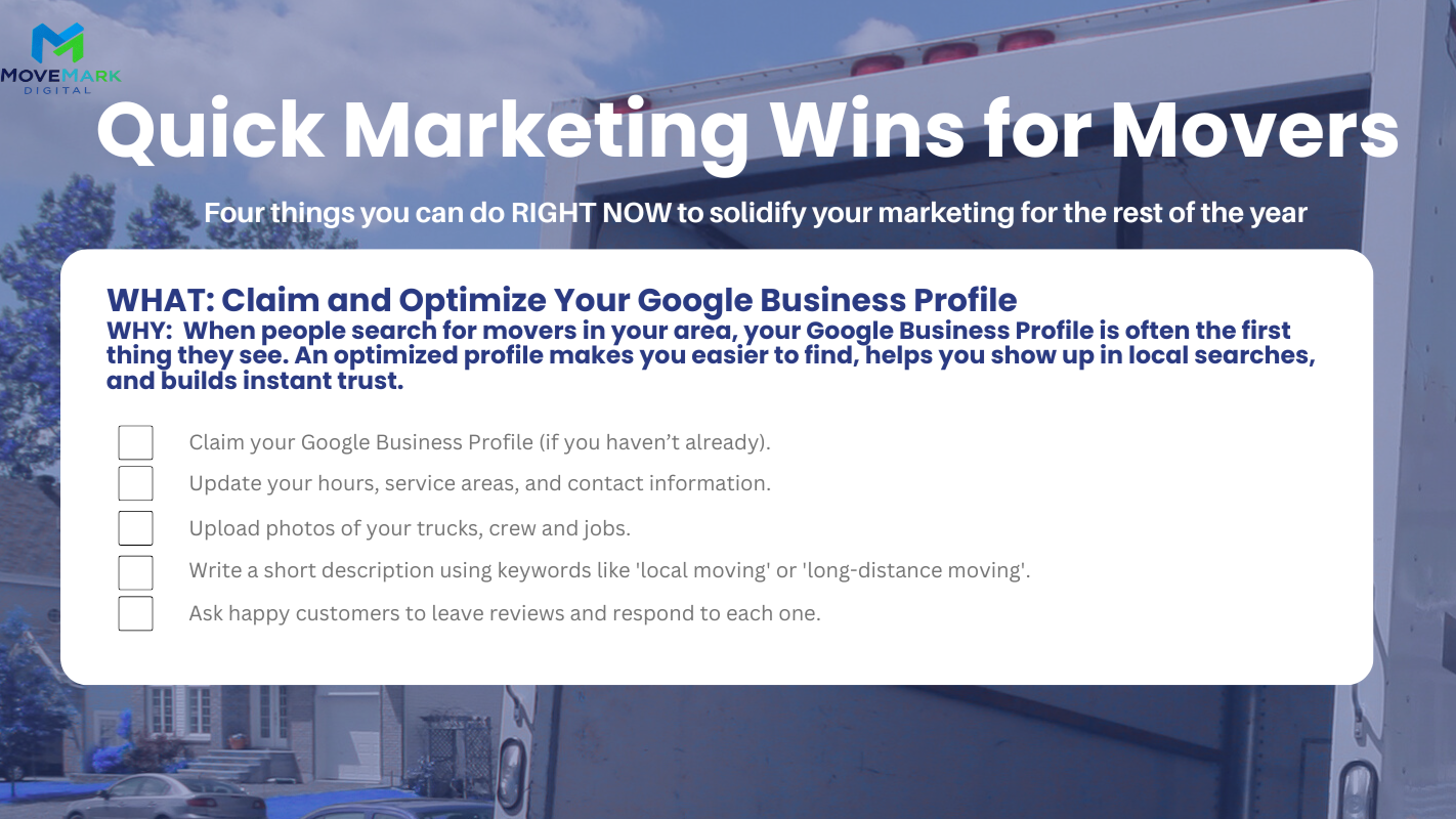 Moving companies know the slow season means potentially fewer jobs. But that also creates an opportunity. If you’re looking to shore up your online marketing for the rest of the year, check out our free guide, Quick Marketing Wins for Movers, which shows a few easy things you can do right now to set yourself up for success through the end of Q4. Fill out the form below for access.